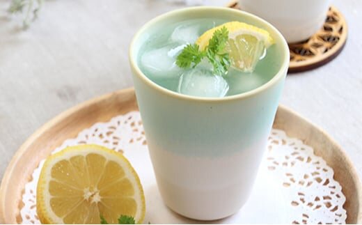 レモンをイメージしたイエローの縁取りに、海を思わせるブルーグリーンのグラデーションがきれいな萩焼のペアカップセットです。