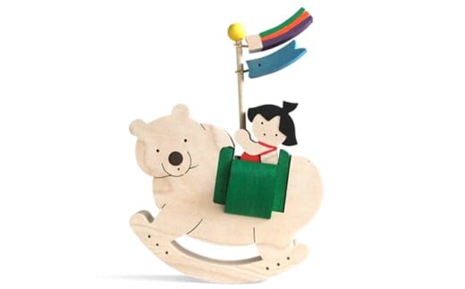熊に乗って遊ぶ幼い金太郎をイメージして組み木にしたものです。金太郎坊やを熊に乗せて揺らしたり、降ろして座らせたりできる五月人形です。