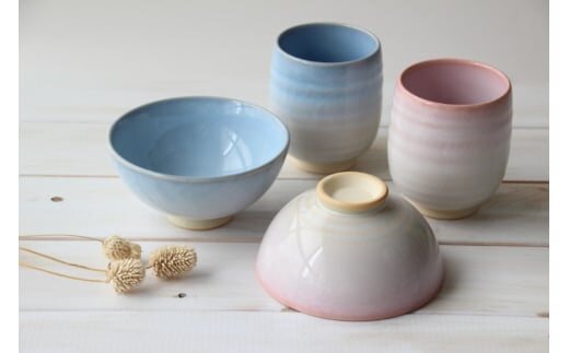 ピンク・ブルー 各1 サイズ: 飯碗(約径11.5cm×H6.0cm) 湯呑(約8.0cm×H9.0cm・270ml) 材質:陶器(萩焼) ※画像はイメージです。 ※萩焼は、ひとつひとつ手作業で仕上げているため、同じ商品でも、色合い、形状、サイズ、容量などが多少異なる場合がございます。 |