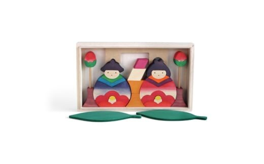 日本の野山に早春から紅い花を咲かせ、春を告げてくれる椿は、萩市の花としても愛されています。この椿の衣装をまとった、ほのぼのと可愛らしい木製のおひな様です。人形や調度品が一つの箱にすべて収まる組み木のひな人形は、コンパクトで場所をとりません。節句のお祝いにも最適です。