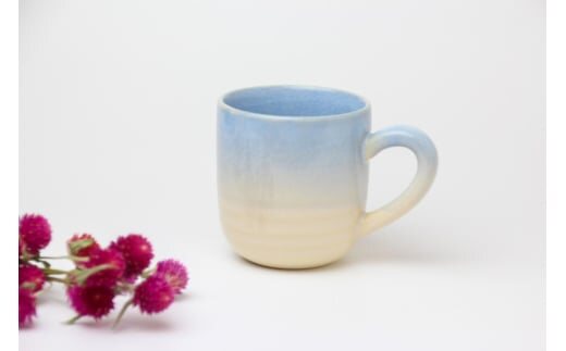 ほんのりと色づく、つぼみのようにふんわりと優しい色合い。ブルーのグラデーションがきれいなマグカップです。