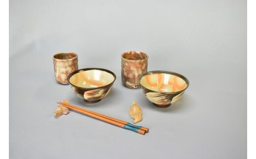 萩焼 福の器揃い(ご飯茶碗・湯呑・鶴亀箸置きセット) |HGH00011
