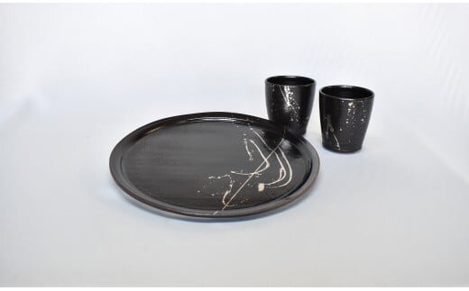 萩焼 銀彩ブラックカップ&プレート皿セット |HGH00021