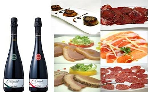 ランブルスコ・セッコ 750ml×1本 ランブルスコ・ドルチェ 750ml×1本 生ハムなど 5品(3種類程度から時期により変動) フォアグラの西京漬け 200g 紅茶鴨スモークとパストラミのセット 200g |