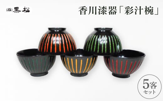 表面を黒漆を塗って仕上げた5客揃えのお汁椀です。