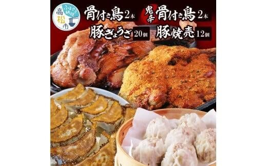 さぬき名物「骨付き鳥」2本/鬼辛骨付き鳥(スパイス付き)2本/ 国産豚ぎょうざ20個/オリーブ豚焼売12個