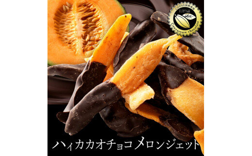 メロン好き!チョコ好き!には心底たまらない商品を作ってしまいました!! 開発者自身、メロンの味、食感、香り全てにおいて文句なしの唯一無二のメロン好きです! そんなメロン信者ともいえるスタッフが、選びぬいたメロンのドライフルーツに、絶対マッチするであろう ハイカカオチョコの苦さを最大限に調節してメロンをチョコ掛けしちゃいました! 実は当店には「オランジェット」という人気商品がありますが、オランジェットにも劣らない自信作です! ドライのメロンだけでも食べだしたら止まらないのですが、さらにほんのり苦いチョコレートをコーティングして、 この美味しさはメロン好き、チョコ好きのかたには絶対に食べていただきたい逸品です。 食感はドライフルーツにしているので、軟らかく食べやすく口にいれて噛んだ瞬間に、 ぷわ~っと生のフルーティなメロンの味が口中に広がります! チョコ掛けはメロンの半分にしか掛けていないので、メロンだけの部分もぜひ味わって食べていただきたいです! こんな、とてつもなく素敵な商品を是非あなたの元へ届けさせてください。
