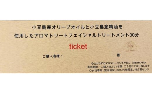 【体験】小豆島産オリーブオイル と 小豆島産アロマエッセンシャルオイル を使用したアロマトリートメント フェイシャルケア30分コースチケット ◆施術場所◆ サロン名:Aromana ココロとカラダのアロマヒーリングサロン 住所:香川県小豆郡小豆島町池田228-36 ギフトハウスナガセ中央店 敷地内 連絡先:090-4509-5885 ※完全予約制サロンです。事前にご予約お願いいたします。 |