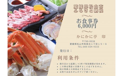 こちらの返礼品は、かにかに亭で利用できるお食事券(6,000円分)です。「かにかに亭」は、ズワイガニとタラバガニをご提供する、カニと焼肉の専門店です。3,278円のお得なズワイガニセットから、8,580円で楽しめる食べ放題まで、カニ愛好家も納得のラインナップ。さらに、スタミナ満点の焼肉食べ放題もご用意しております。当店自慢のカニ料理と焼肉で、お腹も心も大満足間違いなし!家族連れも、デートも、大切なお客様のおもてなしも、かにかに亭で特別なひとときをお過ごしください。