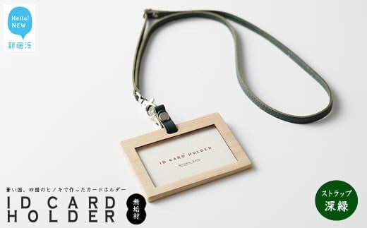 国産無垢ヒノキ IDカードホルダー 横 木製 無垢材 クリア塗装 本革ネックストラップ 【四国加工】: ストラップ深緑