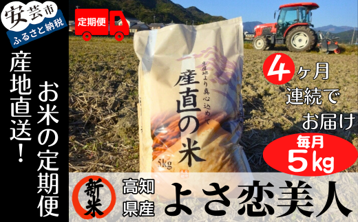 令和7年産 よさ恋美人 白米 4ヵ月連続 定期便 5kg × 4回 20kg お米 精米 新米 コシヒカリ ごはん ご飯 高知県産 弁当 おにぎり 料理 新嘗祭 皇室献上米 令和7年 R7年 極わせ 早期収穫 特A米 食味 品質 良食味米 ふさおとめ 安芸市 高知県
