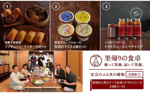 【里帰りの食卓】安芸の人気スイーツ&甘いトマトジュース定期便(3回コース) ふるさと 食文化 地域応援 定期便 洋菓子 フィナンシェ クッキー マドレーヌ ガレット アイス 焼きナス 土佐ジロー 卵 酒粕 ゆずシャーベット トマトジュース ケチャップ 高糖度 ミニトマト 果汁100% 安芸市 高知県