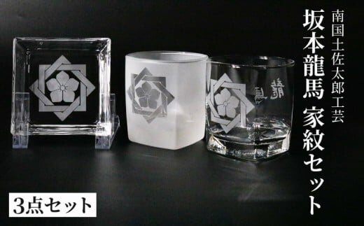 坂本龍馬の家紋グラス2種類と、家紋トレーをセットにしています。グラスは正面に坂本龍馬の家紋、真後ろには斜めに「龍馬」の文字をブラスト加工しています。クリアタイプと濁りタイプのセットになっています。食器だけでなく、ペン立てなどにもご利用いただけます。家紋トレーは多目的トレーです。食器としての利用はしないでください。