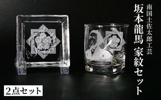 坂本龍馬の家紋グラス2種類と、家紋トレーをセットにしています…