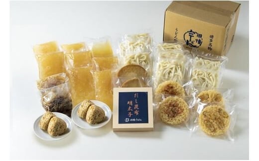 自社で毎日手作りしている天然だしとやわらかい麺を合わせた博多うどん8食に名物のかき揚げスタイルのごぼう天をはじめとした4種の具材、手作りのかしわ飯にぎり4個分、因幡うどん自慢の天然だしに贅沢に漬け込んで作った明太子を合わせた博多の食を満喫できるセットです。