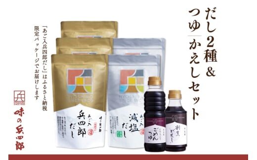 出汁 詰め合わせ あご入兵四郎だし (9g×30袋)3p 減塩タイプ (9g×25袋)2p 割烹がえし ごめんつゆ 各1本 セット [ 味の兵四郎 福岡県 筑紫野市 21760201] あご出汁 あごだし だし ダシ だしパック 出汁パック だし醤油
