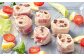 海老を上面に並べ、マッシュルーム入りの白身魚のムースを土台と…