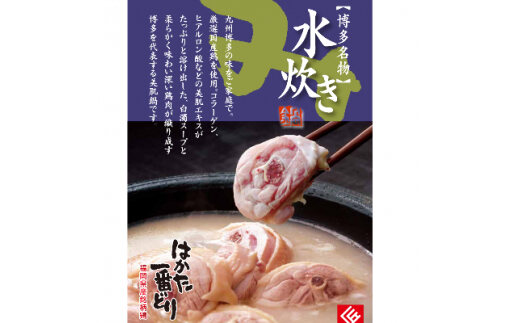 九州博多の味をご家庭でお楽しみいただけます。福岡県産「はかた一番どり」を使用した水炊きセットは濃厚白濁スープが自慢です。「はかた一番どり」の鶏ガラをじっくり時間を掛けて煮だして作るコラーゲン豊富な白濁スープを食塩だけで味付け、さらに鶏のブツ切りからもしみ出しトロトロになったスープはコラーゲン、ヒアルロン酸などのエキスが豊富に溶け込んだ、健康志向の鍋です。白濁スープの深い味わいと鶏肉の濃厚な味わいを是非お楽しみ下さい。