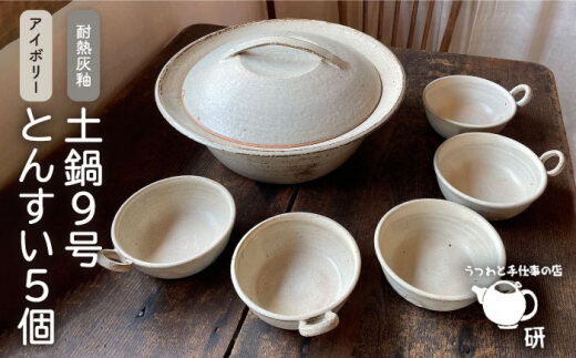 [受注生産] 耐熱 灰釉 シリーズ 土鍋 9号 + とんすい 5個セット アイボリー シリーズ 糸島市 / うつわと手仕事の店 研 [ARD028]