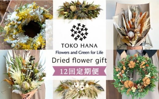 フラワーギフト定期便(月1回、計12回) 商品例:季節のスワッグ、リース、アレンジメント等 ドライフラワーやプリザーブドフラワーが中心となります。 ※お写真はイメージです。内容はお任せとなりますのでご注意ください。 ▼イメージは、 ・華やかなイメージ ・シックなイメージ のどちらかをお選びください。 |