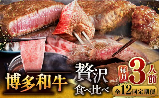 【全12回定期便】博多和牛 贅沢 食べ比べ 3人前 ( ステーキ すき焼き しゃぶしゃぶ ハンバーグ ) ▼ 定期便 食べくらべ セット 詰め合わせ 牛肉 肉 和牛 桂川町/久田精肉店 [ADBM157]