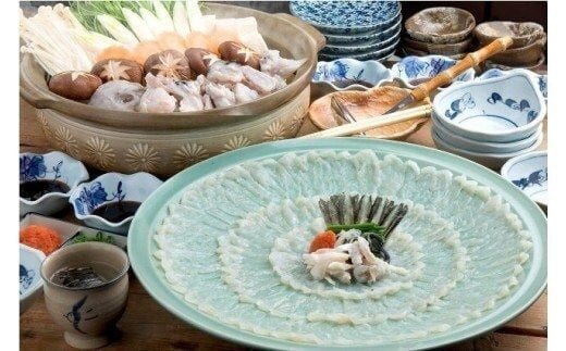 フグ刺し30cm皿1枚分 フグ鍋用アラ約170g フグ皮約50g フグひれ4枚 ポン酢、紅葉おろし |