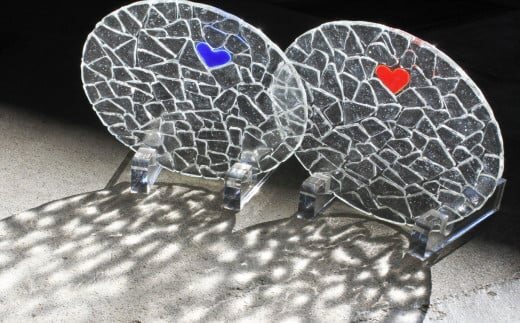 長崎石畳ガラス皿 2枚 ( (赤ハート1枚・青ハート1枚 ) プレート ケーキ皿 長崎ガラス細工ころころ 手づくり