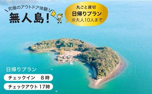 無人島貸し切り 日帰りプラン(大人10人まで) ※日程によってご希望に沿えない場合がございますので、寄附申し込み前に下記連絡先へご連絡をお願いいたします。 <Tel:0959-29-5005> |