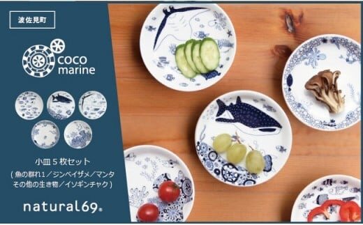 【波佐見焼】natural69 cocomarine 小皿5枚セット 魚の群れ1/ジンベイザメ/マンタ/その他のいきもの/イソギンチャク [QA16]