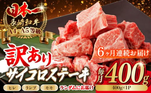 【全6回定期便】【訳あり】長崎和牛 サイコロステーキ 400g A5ランク 赤身(ヒレ・ランプ・モモ ランダムにお届け)【野中精肉店】 [VF92] ヒレサイコロステーキ ヒレステーキ モモサイコロステーキ モモステーキ