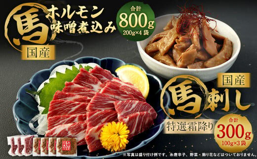 国産馬刺し 特選霜降り(大トロ) 約100g×3袋 ホルモン 味噌煮込み 約200g×4袋 国産 馬