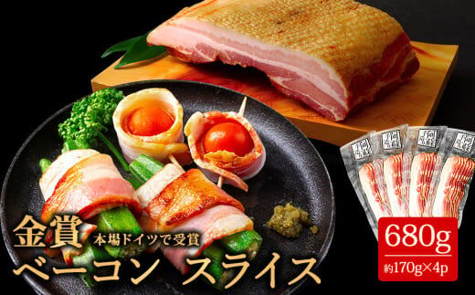 本場ドイツ食肉コンテストsuffa★金賞受賞★ベーコンスライス170g×4パック 計680g 小分けでお届け どんな料理も一味ランクアップ♪ ベーコン ベーコンスライス ふるさと納税 豚肉 オリジナルスパイス 阿蘇 惣菜 ひばり工房 スライス 冷蔵 燻製 手造り まとめ買い おつまみ 朝食 贅沢 美味しい ご飯 お手軽 人気 ジューシー 金賞受賞 熊本県 阿蘇市