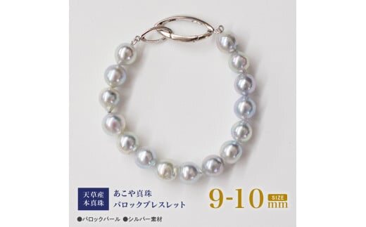 S101-392_天草産 9mm - 10mm ナチュラル ブルー バロック あこや真珠 パール ブレスレット【A:鎖型】