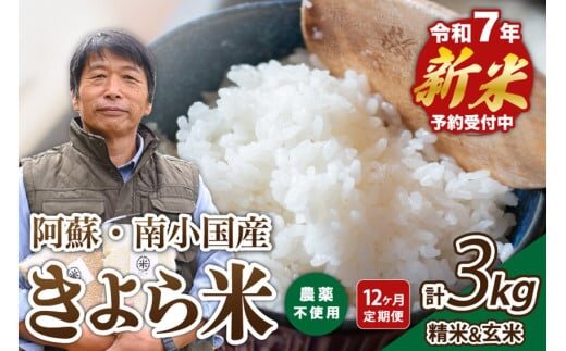 【予約受付】【12ヶ月定期便】令和7年産・新米 きよら米 3kg 令和7年産 南小国産 白米 玄米 食べ比べ 12ヶ月 定期便 新米 あきげしき 精米 米 お米 玄米対応可能 ご飯 ごはん 無農薬 農薬不使用 有機栽培 真空パック 産地直送 熊本 南小国 送料無料