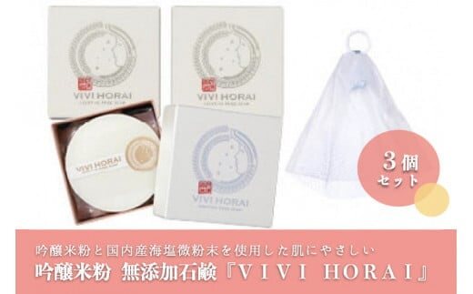 ■吟醸米粉 無添加石鹸「VIVI HORAI(美々蓬莱)」80g×3個(泡立ネット付) ●原材料 石鹸素地・国内産海塩・吟醸米パウダー・ヒアルロン酸 |