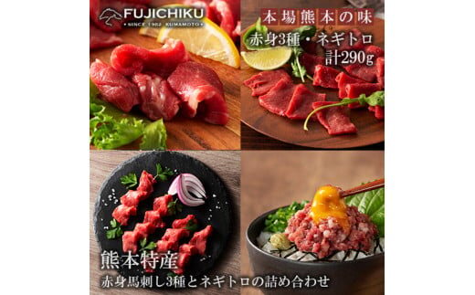 【フジチク】熊本と畜 ふじ馬刺し 赤身馬刺し3種とネギトロの詰め合わせ ふじ馬刺し 赤身 希少部位 上赤身 ロース ランプ ネギトロ 赤身各80g ネギトロ50g 計290g 専用タレ 冷凍 真空パック ISO22000取得 UKAS認証 牧場直送 ギフト お祝い お礼 プレゼント 贈答品 お取り寄せ