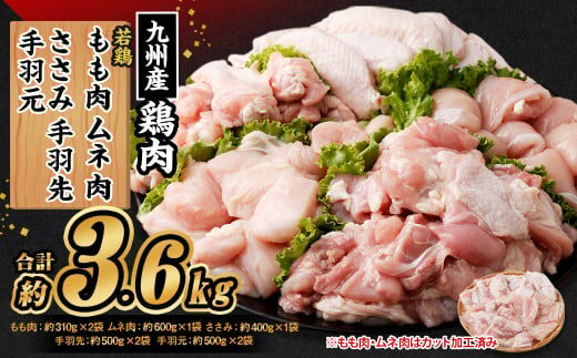 九州産若鶏 もも肉 (約310g×2袋) むね肉 (約600g×1袋) ささみ (約400g×1袋) 手羽先 (約500g×2袋) 手羽元 (約500g×2袋)合計約3.6kg セット 鶏肉 小分け 九州産 国産 冷凍