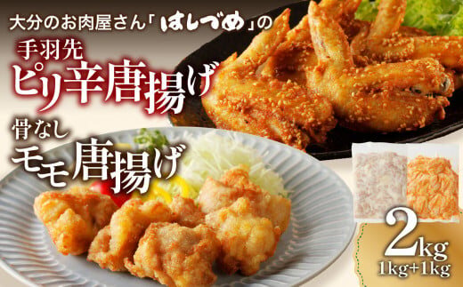 大分のお肉屋さん「はしづめ」の国産鶏手羽先ピリ辛唐揚げ、骨なしモモ唐揚げ用お肉セット約2kg 唐揚げ から揚げ からあげ 手羽先 モモ肉 ピリ辛 国産 鶏 おかず おつまみ A03041