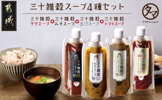 三十雑穀スープ4種セット※ポスト投函_LC-9003_(都城市) 30種 穀物 味噌 椎茸エキス 黄金生姜 スープの素 味噌汁 だし 鰹節 昆布 椎茸 鯖節 あごだし 豆板醤 ごま油 完熟トマト ロレーヌ岩塩