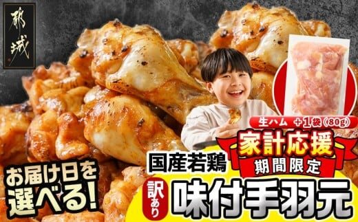 家計応援キャンペーン!【お届け日を選べる♪】【訳あり】簡単調理!国産若鶏味付手羽元1kg×7袋+生ハム80g_12-L904-D-CP_(都城市) 国産若鶏 手羽元 味付き 7kg 低脂肪 低カロリー 揚げて 焼いて カレー 訳アリ バラツキ 鶏肉 唐揚げ 簡単調理