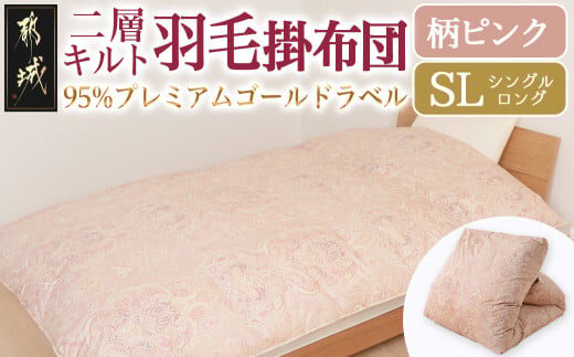 【柄ピンク】二層キルト羽毛掛布団95%プレミアムゴールドラベル1.2kg SL_AK-J203-gpk_(都城市) 綿100% 80サテン 光沢 しなやかさ 柔らかさ 心地よい ホワイトグースダウン プレミアムゴールドラベル 羽毛ふとん 高級キルト ダウンプルーフ加工 7年保証付