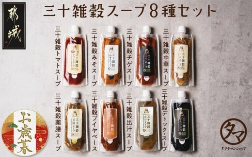 【お歳暮】三十雑穀スープ8種セット≪11月17日~12月21日お届け≫_LG-9002-WG_(都城市) 30種 穀物 味噌 椎茸エキス 黄金生姜 スープの素 味噌汁 だし 鰹節 昆布 椎茸 鯖節 あごだし 豆板醤 ごま油 完熟トマト ロレーヌ岩塩 薬膳 高麗人参 花椒 生姜 黒ごま 活性炭 ブイヤベース ギフト お歳暮