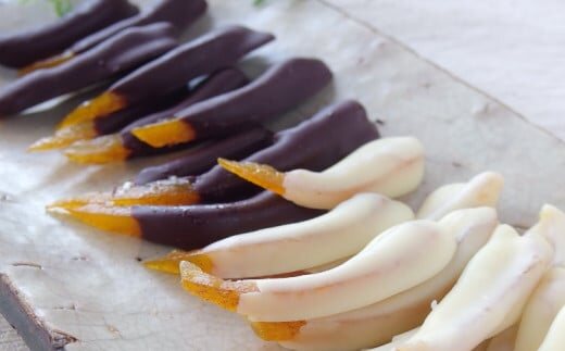 綾町産の日向夏の皮をオーガニック粗糖で長時間かけて煮込んで作ったピールに、オーガニッククーベルホワイト&ビターチョコをテンパリングして1本1本手で丁寧に作った手作りピールチョコです。