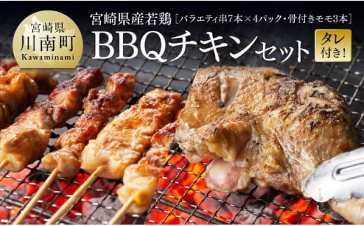 ※令和7年9月発送※宮崎県産若鶏 BBQチキンセット(バラエティセット串7本×4P・骨付きモモ3本)タレ付き! 【 肉 鶏肉 串 骨付き バーベキュー 九州産 川南町 おうちごはん 送料無料 】