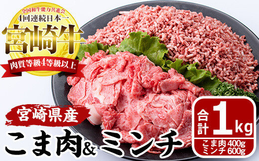 宮崎牛 こま肉 ミンチ セット(計1kg・こま肉400g、ミンチ600g)牛肉 お肉 こま切れ ひき肉 黒毛和牛 ブランド和牛 詰め合わせ 詰合せ 国産 冷凍【MF-9】【エムファーム】