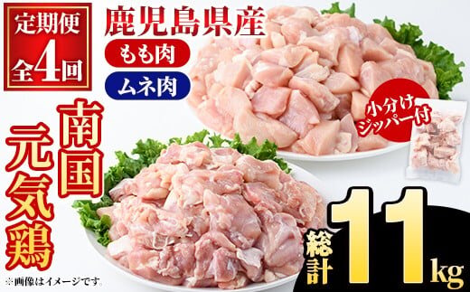 <定期便・全4回(隔月)>鹿児島県産!南国元気鶏 もも肉・ムネ肉定期便(総計11kg) 国産 九州産 鹿児島産 モモ肉 鶏モモ むね肉 胸肉 鶏ムネ 小分け 定期便 おかず おつまみ【さるがく水産】akn028-42