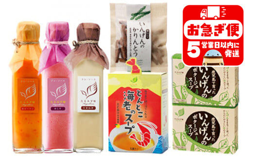 ・いんげんのポタージュスープ 16g×3袋入×2箱 ・とんとこ海老のスープ 5g×5袋入×1箱 ・ドレ・ソース 200ml×3本 (赤ピーマン/赤しそ/たまねぎ) ・かりんとう いんげん 30g×1袋 |