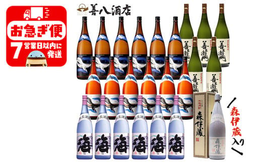 大海酒造“海シリーズ”の黄麹仕込み「海」、白麹・黒麹仕込みの「くじらのボトル」、当店オリジナル「かめ壷熟成 善左衛門」を合わせた、合計24本をお届けいたします。