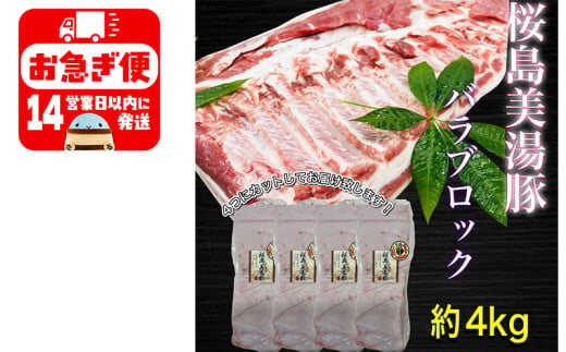 鹿児島県垂水市産の「桜島美湯豚」の黒豚バラブロック計4.0kgです。