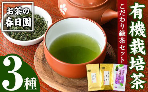 No.055 日置市の有機栽培茶こだわり3点セット 国産 九州 お茶 茶葉 日本茶 飲み比べ 詰め合わせ【春日園 川路製茶】